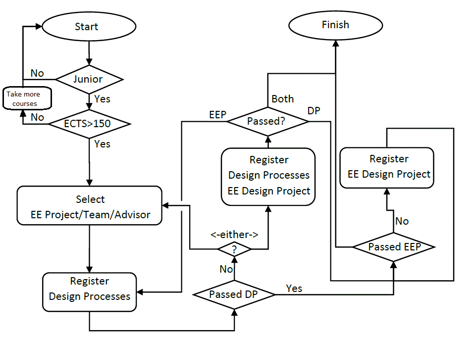 Design Processes and EE Design courses are senior-year courses. Both of these courses are offered in Fall and Spring semesters. Under normal conditions, the senior student applies one of the senior projects that are announced in the department mail group before registering these courses. Once the selection is approved, the student registers the Design Process course during the registration days of the next semester and hopefully passes the course. The following semester, the student registers the EE Design (Electrical Engineering Design) course. If the student fails the Design Processes course, he or she can take both courses in the same semester. For the Design Process course, minimum 150 ECTS passing credit is required.